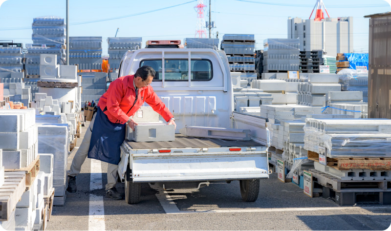 資材関連など重い商品については、売場にクルマを持ち込めるようなレイアウトとし、その場で直接積み込みができるような仕組み。また、それ以外の商品についても要望に応じて駐車場のクルマまで積み込みをお手伝いしています。